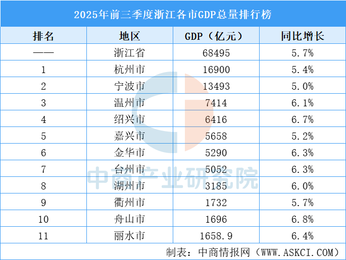 中商情报网讯:前三季度,浙江经济运转稳中有进、向新向好,GDP总量68495亿元,同比增加5.7%。杭州、宁波GDP总量超万亿,7城GDP增速超全省中等水准。